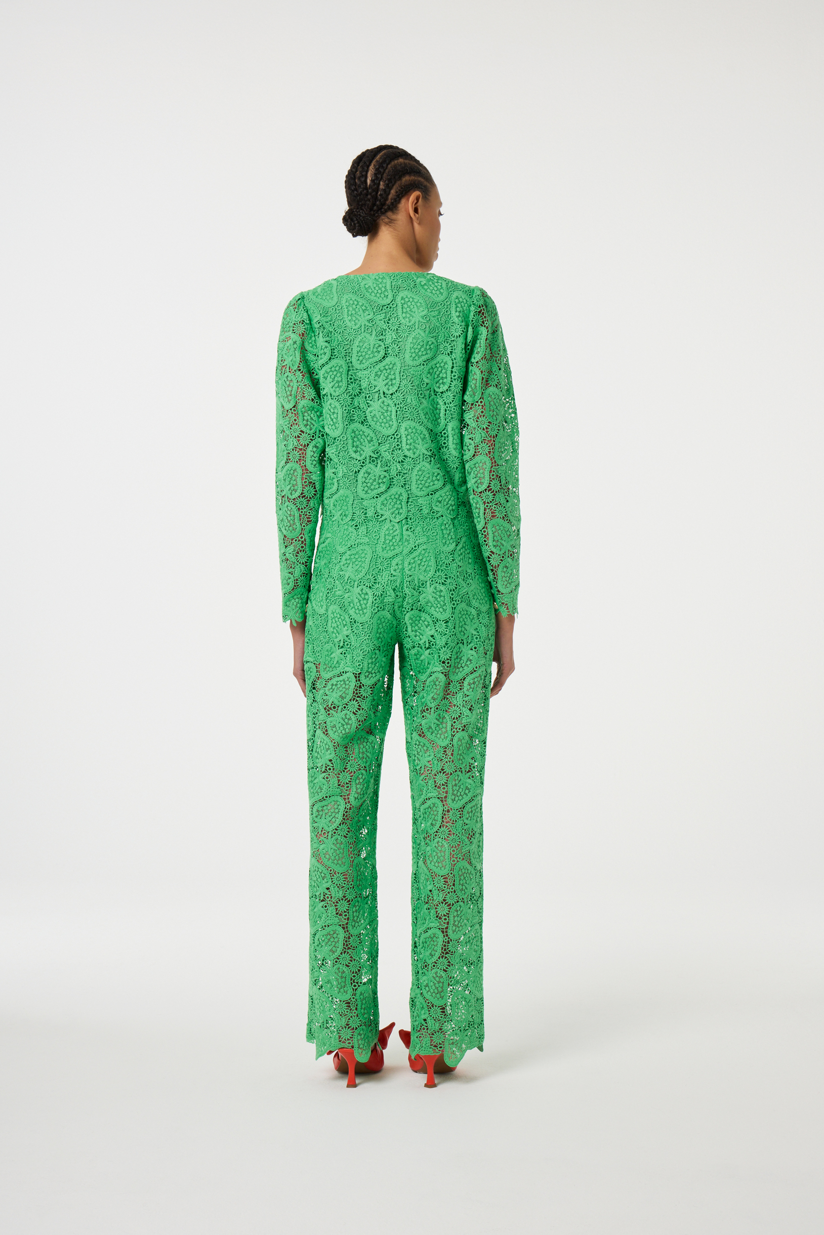 Deze groene kanten broek heeft een speels aardbeienpatroon en een doorzichtig ontwerp, waardoor het een perfect statement piece is voor de zomer. Combineer met een T-shirt en sneakers voor een casual look of stijl het met hakken en een topje voor een chique avondoutfit