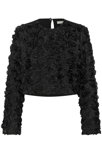 Blouse met lange mouwen en 3D-bloemenapplicaties op de voorkant en mouwen. Voorzien van ronde hals, korte lengte en een knoopsluiting met keyhole aan de achterkant. Het model is 175 cm lang en draagt maat S/36.