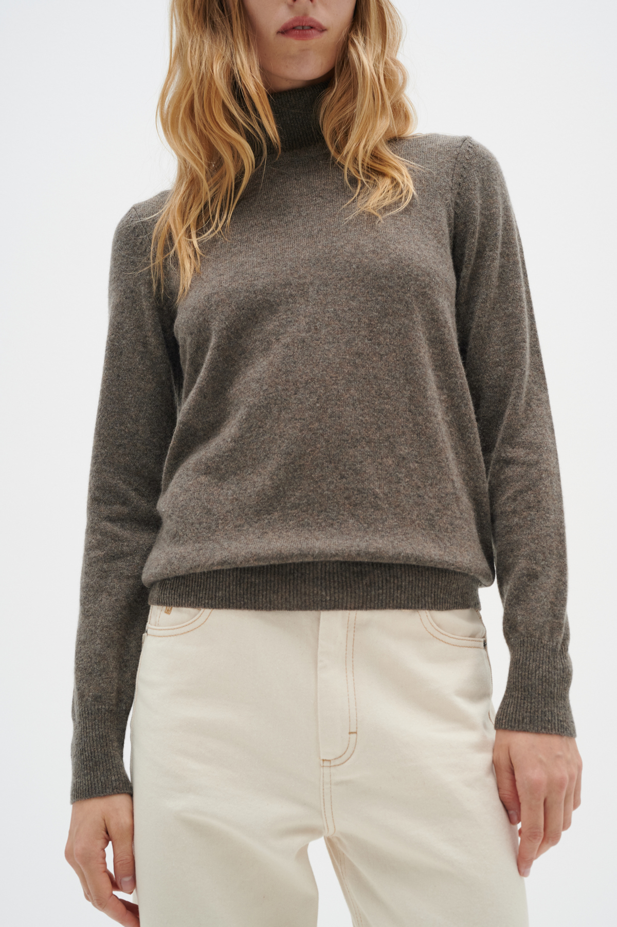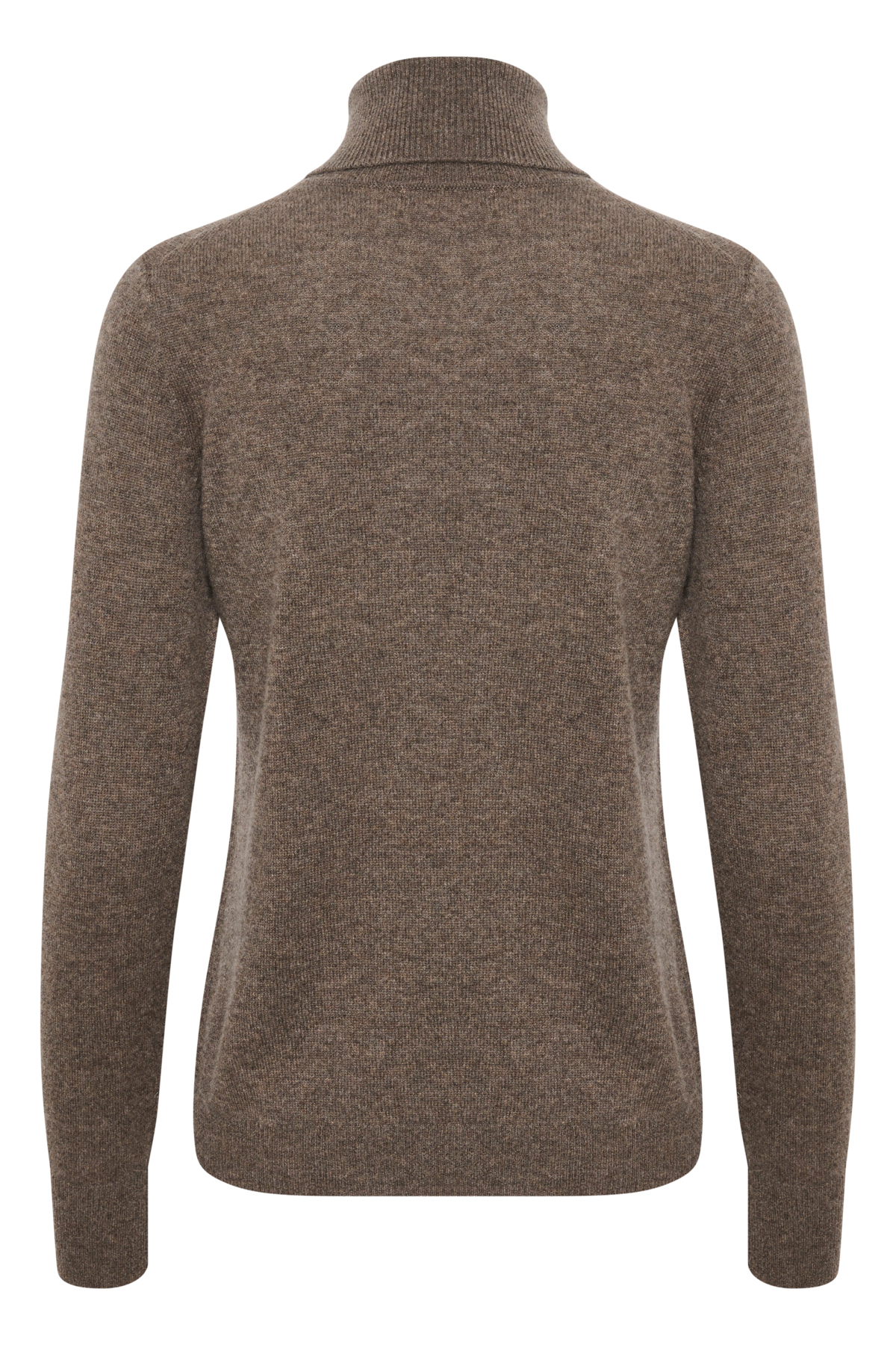 Bruin gemĂȘleerde coltrui van 100% kasjmier met ribboorden en een klassieke pasvorm. Een tijdloos model in extra zachte en warme kwaliteit. Het model is 176 cm lang en draagt maat 36/S.