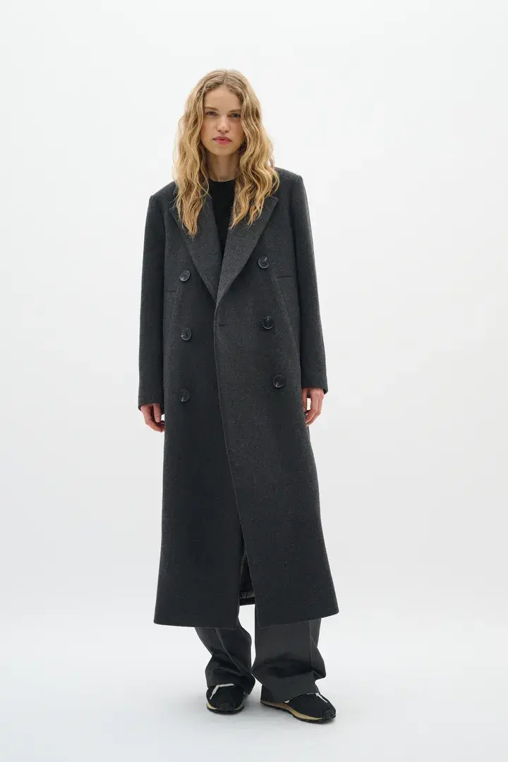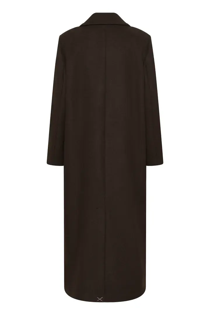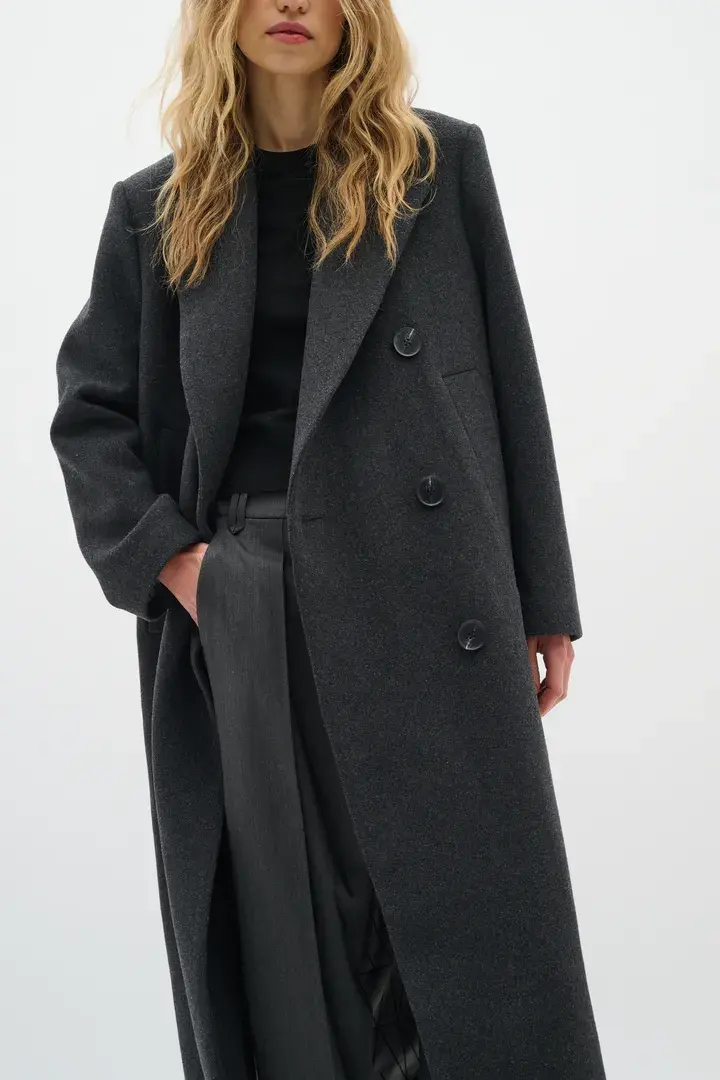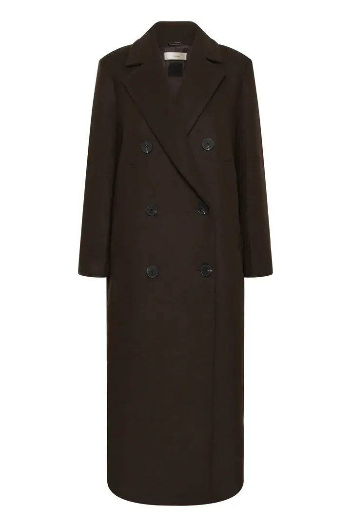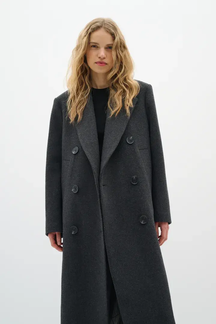 Deze damesmantel met dubbelle rij knopen heeft een getailleerde pasvorm en lange snit. Afgewerkt met reverskraag, knoopsluiting en handige steekzakken.